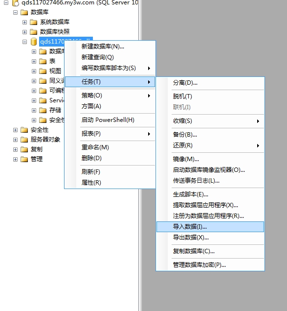 選擇數據庫,右擊,在下拉菜單中選擇“任務”——“導入數據”