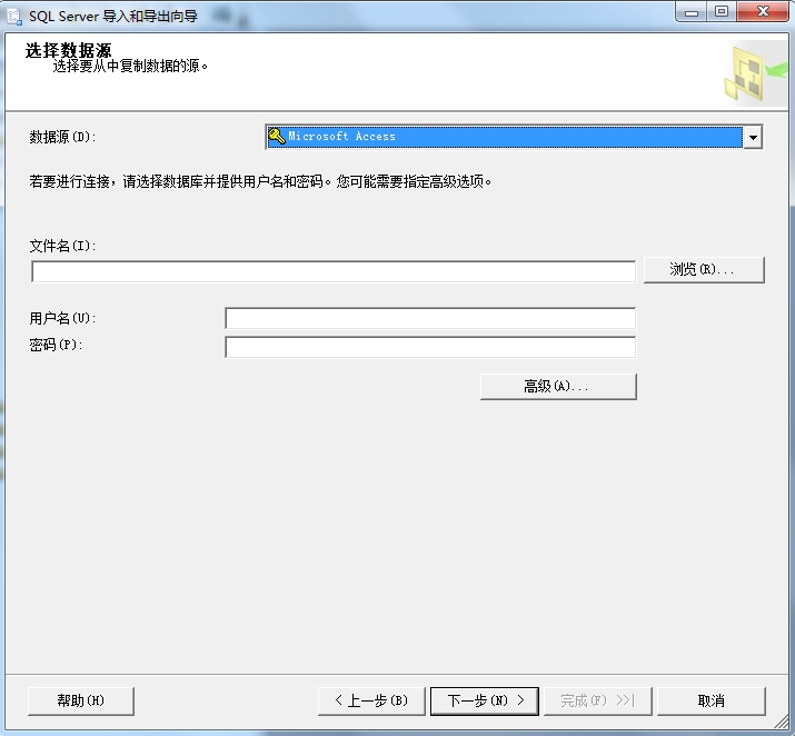 數據源中選擇 Microseoft Access,點擊文件名右側的瀏覽,選擇準備好的access數據庫文件,用戶名跟密碼可以不用填寫,點擊下一步;