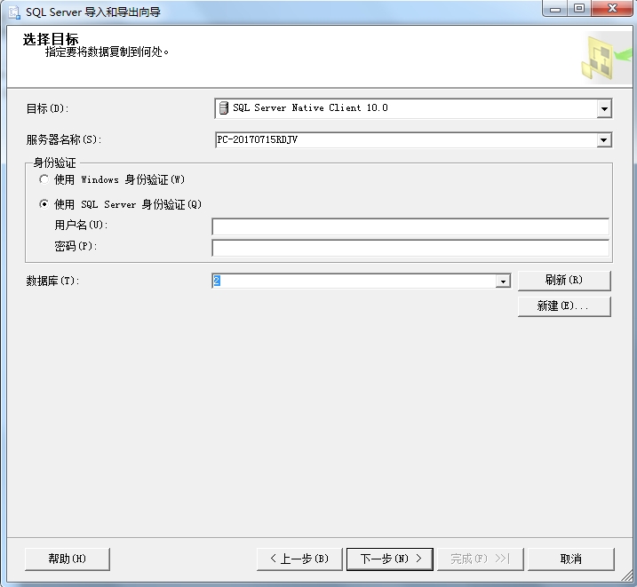 目標中選擇SQL Server Native Client 10.0或者是默認,在服務器名稱右側點擊下拉箭頭選擇第一步鏈接到的服務器名稱(或者手動輸入),根據已有信息,填寫用戶名密碼已經數據庫名稱(即下圖中“2”的位置),點擊下一步;