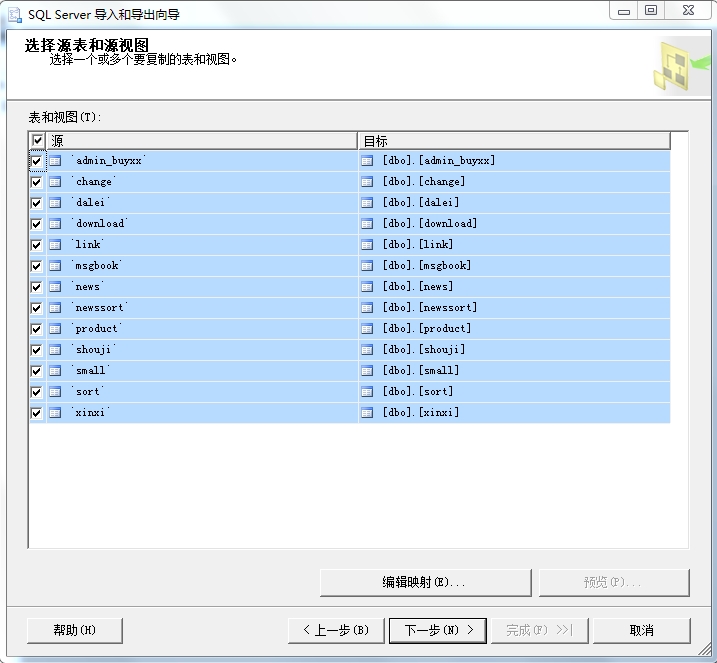 選擇表跟視圖下面的源(在源前面的復選框中打對勾),點擊下一步;